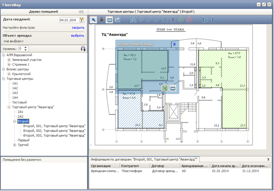 Данные в режиме on-line о свободных площадях, дебиторской задолженности арендаторах, действующих договорах