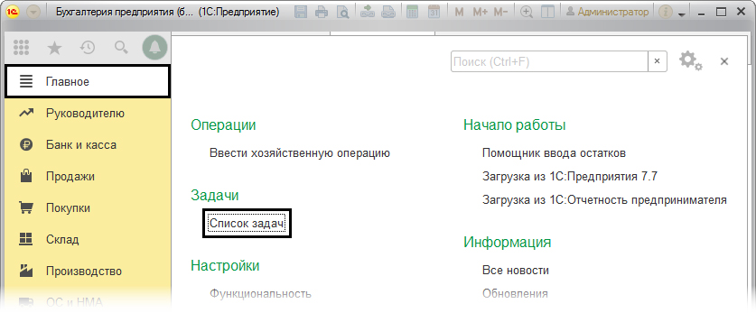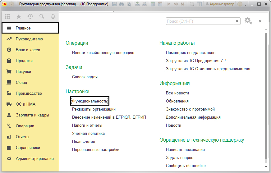 Для этого необходимо перейти по следующему пути: «Главное», далее «Настройки», где выбрать «Функциональность».