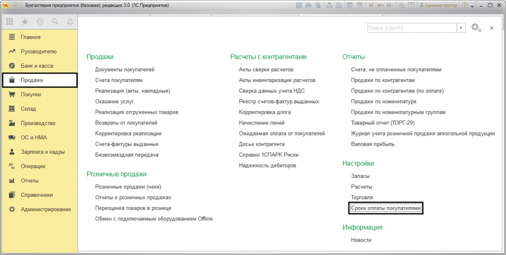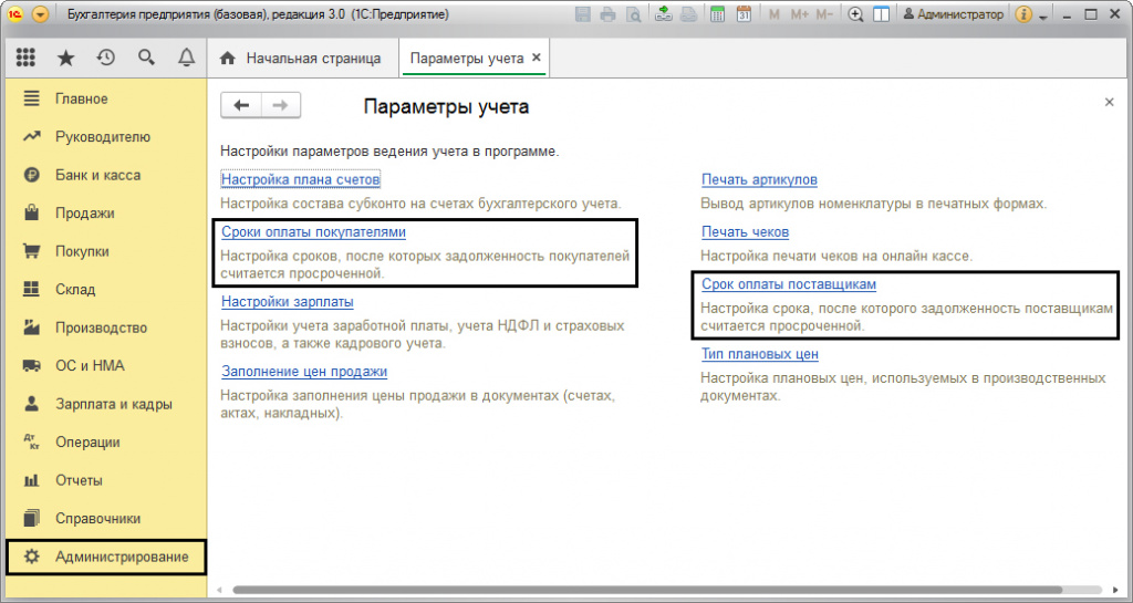 Также настройки установки сроков оплаты доступны в разделе меню «Администрирование».