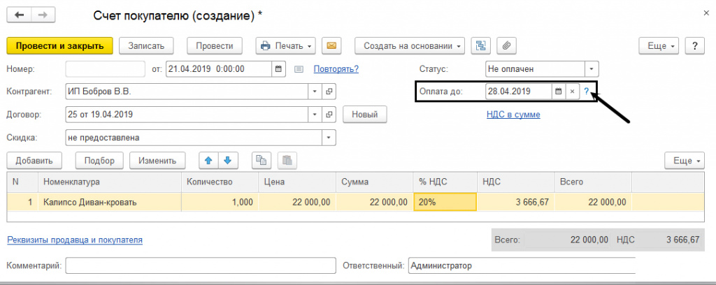 Если зайти на вкладку «Счет покупателю», то там также есть возможность для установки сроков оплаты. И это не требует каких-либо настроек функциональности программы. Если при этом нажать на знак вопроса, то отобразиться подсказка с гиперссылкой, где можно также выполнить настройки сроков платежей или перейти в меню настройки непосредственно оттуда.