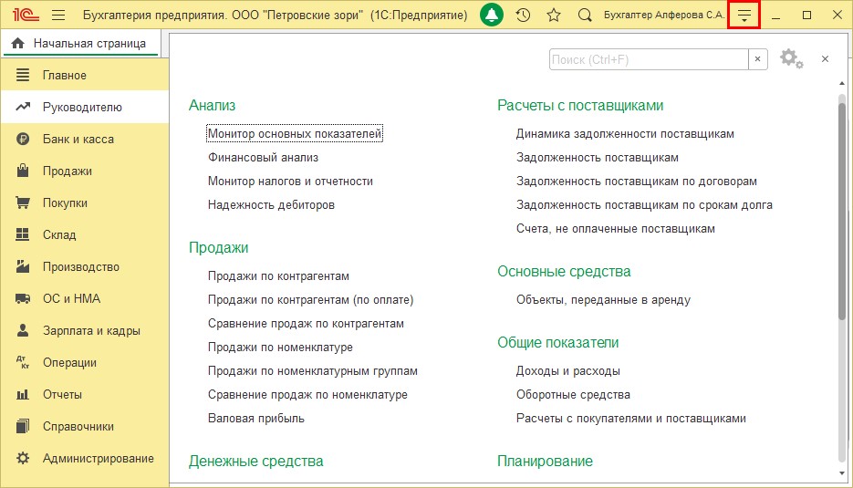 Если пользователь уже находится в работе и у него открыт другой раздел, то переход на начальную страницу осуществляется нажатием «кнопки-стрелочки», которая расположена в правом верхнем углу в непосредственной близости с именем пользователя.