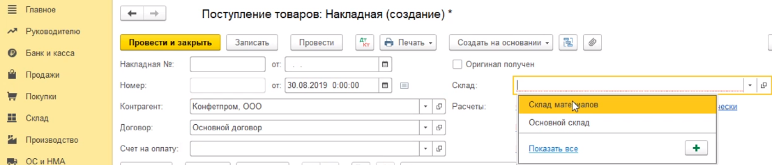 Выбираем контрагента, в нашем случае ООО "Конфетпром".