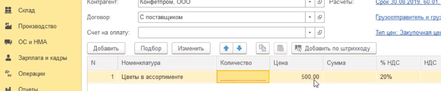 Теперь мы хотим сделать так, чтобы в документах поступления автоматически проставлялась именно эта цена для этой номенклатуры. Делаем документ поступление. Нажимаем покупки, поступление (акты, накладные).