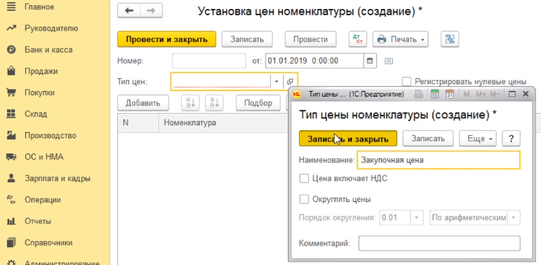 Придумываем наименование. Наименование может быть абсолютно любым. Главное, чтобы вы понимали для чего будете использовать данный тип цен. В нашем случае назовем "закупочная цена". Нажимаем записать и закрыть.