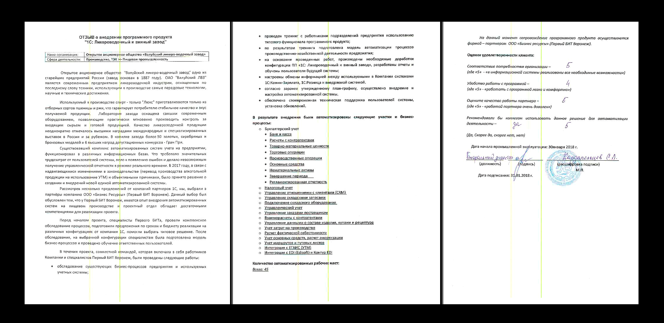 Система полностью адаптирована под сложившийся на заводе подход к производственному и торговому учету. В рамках проекта предприятие перешло на использование УТМ при фиксации движений спирта и спиртосодержащей продукции. Все подразделения предприятия включены в использование системы, что позволяет получить достоверный финансовый результат деятельности предприятия.