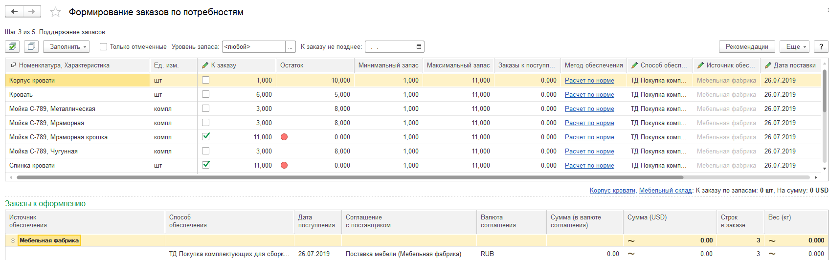 На основании этих данных система рекомендует к заказу товар на сумму 300 штук. - поддерживать запас, так как текущий остаток товара на складе равен желаемому минимальному остатку.