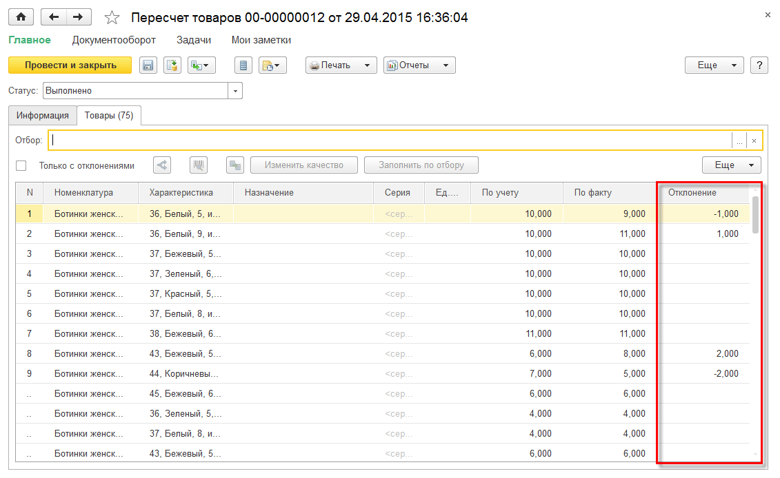 При проводке процесса пересчета товаров возможно отражение фактического и учетного количества товаров, отклонений фактического количества от учетного.
